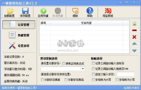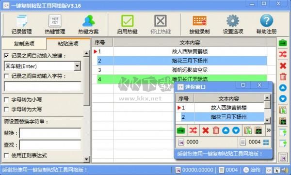 一鍵復制粘貼工具是一款能夠幫助用戶快捷處理文本的編輯的一鍵復制粘貼工具,用戶們可以連續(xù)進行復制,順序粘貼,循環(huán)粘貼的功能,省去了頻繁的切換窗口的麻煩,功能強大,簡單好用,感興趣的用戶們快來KK下載體驗吧~