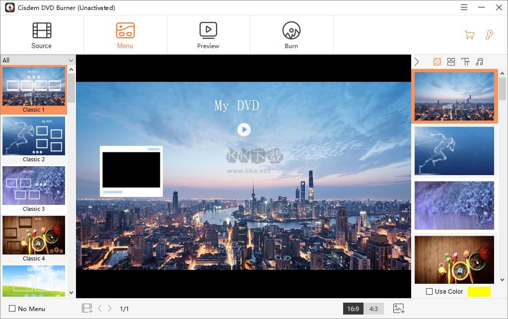 Cisdem DVD 刻錄機(jī)為不同的場(chǎng)合和活動(dòng)提供各種免費(fèi)的 DVD 菜單模板,例如 經(jīng)典、圣誕節(jié)、新年、情人節(jié)、生日、婚禮、畢業(yè)、運(yùn)動(dòng)、嬰兒、旅行和 更多。您可以輕松選擇一個(gè)適合您 DVD 主題的菜單,或者只是沒(méi)有菜單。此外,您可以設(shè)置視頻縱橫比并自定義 DVD 菜單。有 2 個(gè)常見(jiàn)的 寬高比:寬屏為 16:9,全屏為 4:3。您可以選擇菜單背景 從純色或?qū)氲膱D像,將標(biāo)題按鈕顯示為框架、框架和標(biāo)簽或標(biāo)簽,顯示菜單 按鈕作為圖標(biāo)、圖標(biāo)和標(biāo)簽、標(biāo)簽或只是隱藏它們,編輯菜單文本并定義其字體、大小和 顏色。為了獲得更多創(chuàng)意,您甚至可以添加自己喜歡的背景音樂(lè)并應(yīng)用淡入/淡出 影響。