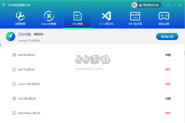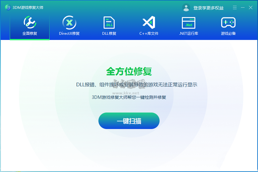 1. 檢測(cè)并修復(fù)win7、win10、win11系統(tǒng)中缺失、損壞或過時(shí)的運(yùn)行庫文件,集成最新DirectX Redist(含DirectX9[dx9]、DirectX10[dx10]、DirectX11[dx11]、DirectX12[dx12]),快速修復(fù)因DirectX錯(cuò)誤導(dǎo)致游戲啟動(dòng)報(bào)錯(cuò)、崩潰、軟件無法打開等問題(如:0xc000007b 0x00000ba等);自動(dòng)適配系統(tǒng),修復(fù)異常dll文件、VC++組件解決因版本不正常造成的錯(cuò)誤、文件缺失等dll錯(cuò)誤問題(如:XINPUT1_3.DLL、D3DX9-42.DLL、D3DX9-43.DLL、D3DCompilier_43.dll、X3DAudio3_7.dll、MSVCP110.DLL、MSVCRTD.DLL、MSVCP140.DLL、VCRUNTIME140.DLL、API-MS-WIN-CRT-RUNTIME-L1-1-0.DLL、API-MS-WIN-CRT-TIME-L1-1-0.DLL等)。