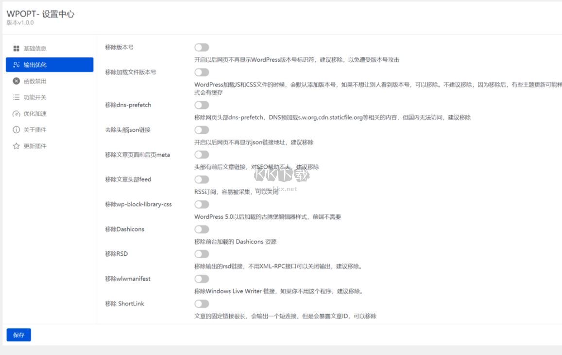 WPOPT優(yōu)化插件是一款針對WordPress底層功能優(yōu)化的專業(yè)插件,用戶們可以在WPOPT優(yōu)化插件用于便捷的使用功能,還有系統(tǒng)加速和優(yōu)化等功能,給你提供了十多種的功能開關(guān),還有詳細(xì)的功能說明給大家提供,WPOPT優(yōu)化插件永久給大家提供免費(fèi)的優(yōu)化解決方案,感興趣的用戶快來KK下載體驗(yàn)吧~