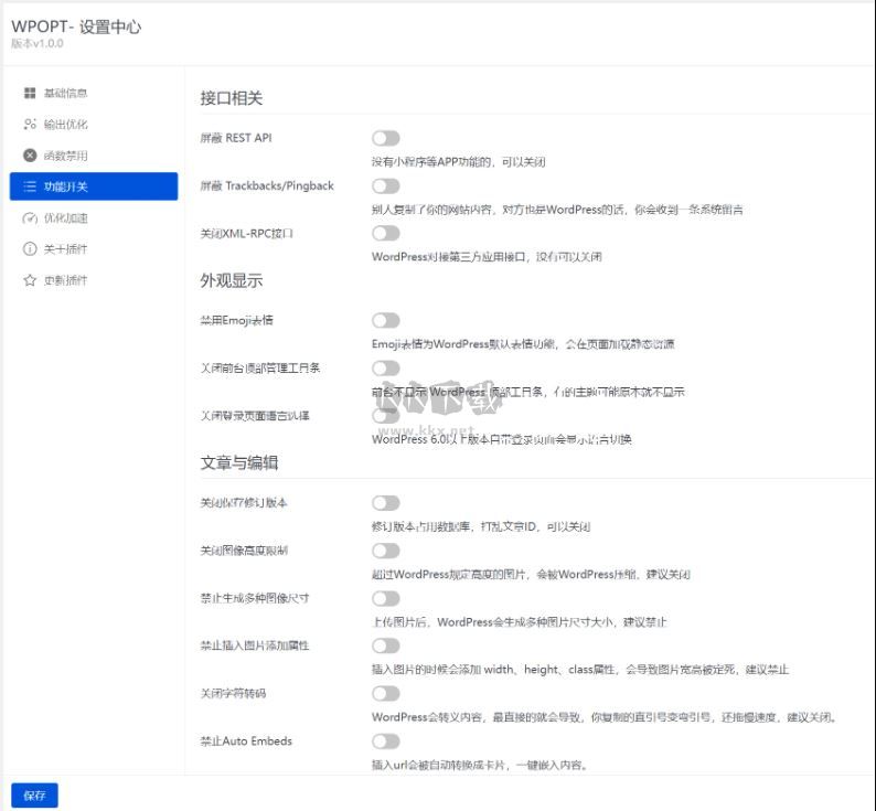 功能開關(guān): 通過開關(guān)控制REST API、Trackbacks/Pingback、XML-RPC接口等,增加網(wǎng)站安全性。