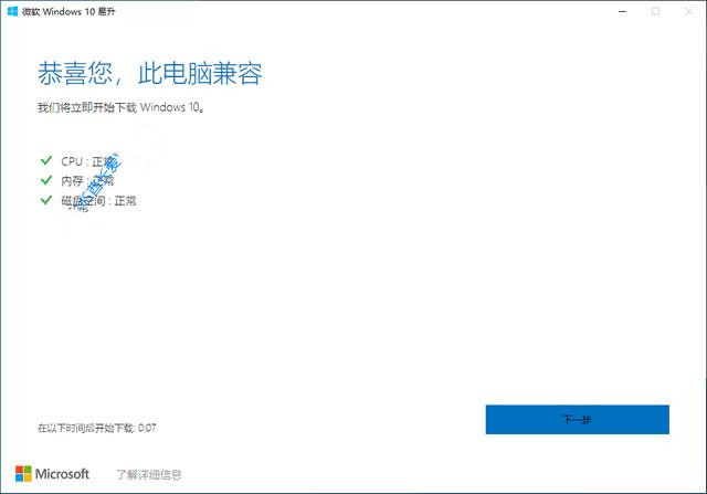 3、主要檢測“CPU、內(nèi)存和磁盤空間”三個項目,“恭喜您,此電腦兼容”后點擊“下一步”,就會開始下載Windows10更新。如下圖所示: