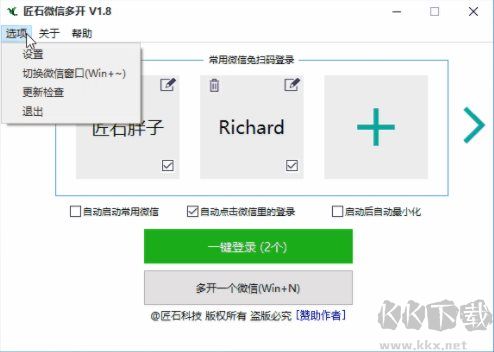 匠石微信多開(kāi)是一款微信電腦版的多開(kāi)工具,主要特點(diǎn)是可以無(wú)限多開(kāi),可配置一鍵多開(kāi),無(wú)需掃碼就可以登錄,是微信電腦版多開(kāi)輔助利器,并且支持快捷召喚指定微信。