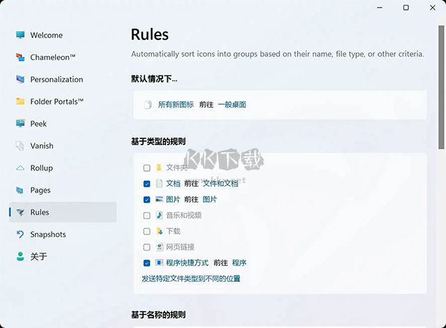定義桌面上圖標(biāo)排列方式的規(guī)則,軟件會根據(jù)您的規(guī)則自動將新圖標(biāo)分類到您選擇的軟件中。