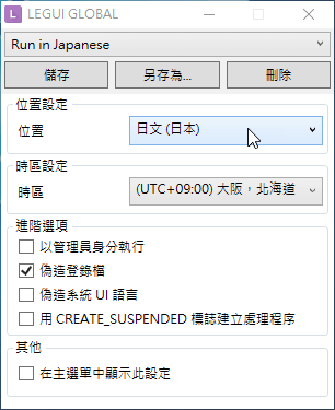 第2步:開啟LocaleEmulator設(shè)定視窗,在「位置設(shè)定」選單選取要顯示的文字語言,其他時區(qū)等進(jìn)階選項如果有需要的話也可以先勾選。