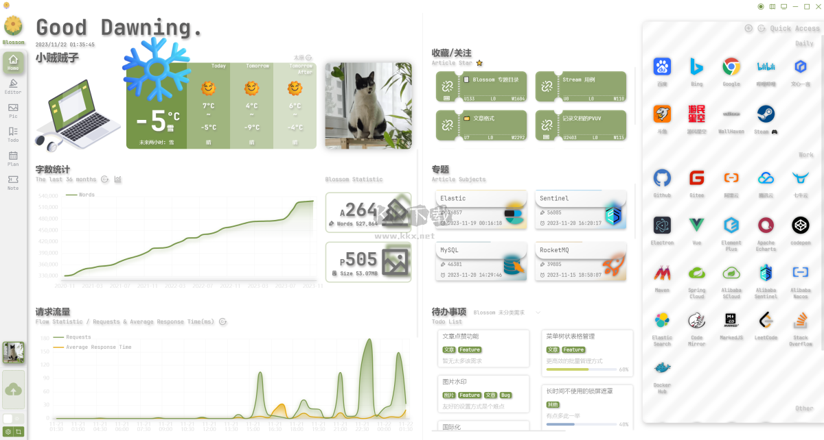 數(shù)據(jù)可視化: 提供筆記總字數(shù)折線圖、筆記編輯數(shù)量熱力圖、服務器請求量折線圖等可視化工具,幫助用戶更好地了解和管理數(shù)據(jù)。