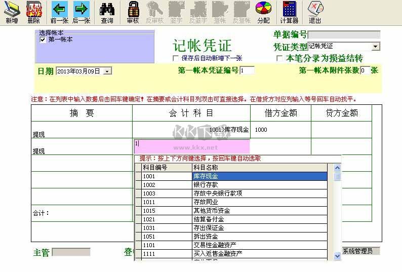 6、可以直接通過樹狀目錄選擇會(huì)計(jì)科目;也可以通過會(huì)計(jì)科目編碼快速輸入;