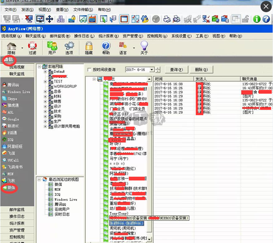 局域網(wǎng)內(nèi)網(wǎng)監(jiān)控:屏幕監(jiān)視和錄象、軟硬件資產(chǎn)管理、光驅(qū)和USB等硬件禁止、應(yīng)用軟件限制、打印監(jiān)控、ARP火墻、消息發(fā)布、日志報警、遠(yuǎn)程文件自動備份功能、禁止修改本地連接屬性、禁止聊天工具傳輸文件、通過網(wǎng)頁發(fā)送文件監(jiān)視、遠(yuǎn)程文件資源管理、支持遠(yuǎn)程關(guān)機注銷等、支持MSN/MSN shell/新浪UC/ICQ/AOL/SKYP E/E話通/YAHOO通/貿(mào)易通/google talk/淘寶旺旺/飛信/UUCALL/飛鴿傳書/飛秋/騰訊TM/騰訊TIM/微信/釘釘/企業(yè)微信/QQ聊天記錄等功能;