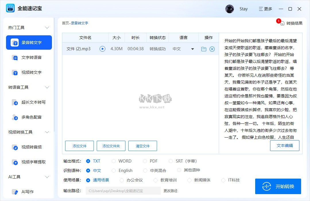 選擇需要記錄的文件內容上傳完成,下方可選擇文件輸出格式,語種等