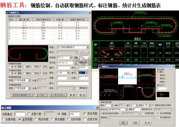 3、 鋼筋圖軟件包(鋼筋繪制、標(biāo)注、自動(dòng)生成鋼筋表材料表,圖、表可關(guān)聯(lián)修改)。
