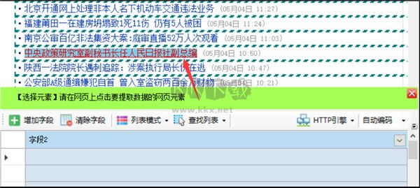 系統(tǒng)會(huì)自動(dòng)生成標(biāo)題和鏈接地址字段,并在字段列表中顯示出提取到的字段內(nèi)容,當(dāng)點(diǎn)擊底部表格字段標(biāo)題時(shí),會(huì)在網(wǎng)頁(yè)上以黃色背景高亮顯示出匹配的內(nèi)容