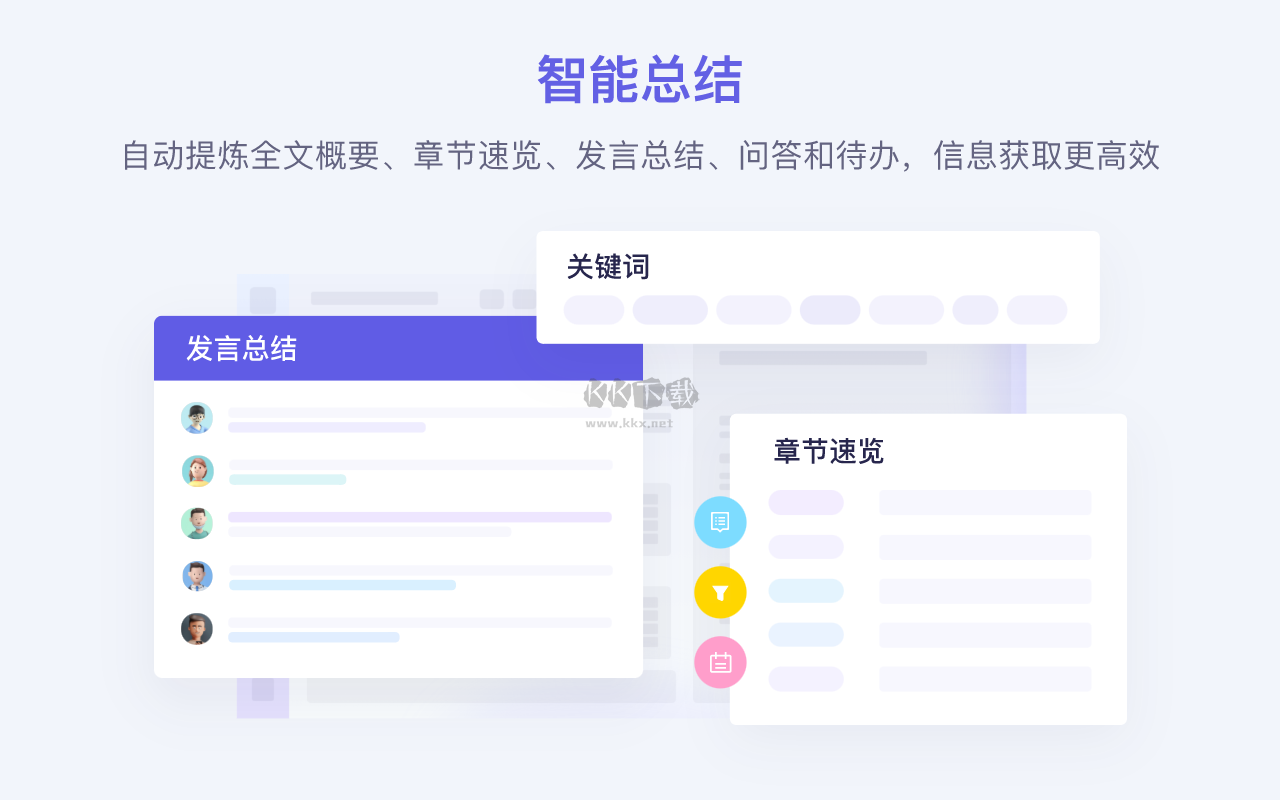 智能總結(jié),高效回顧,關(guān)鍵信息一清二楚,全文總結(jié)一目了然,議程待辦了如指掌,問答內(nèi)容一覽無余