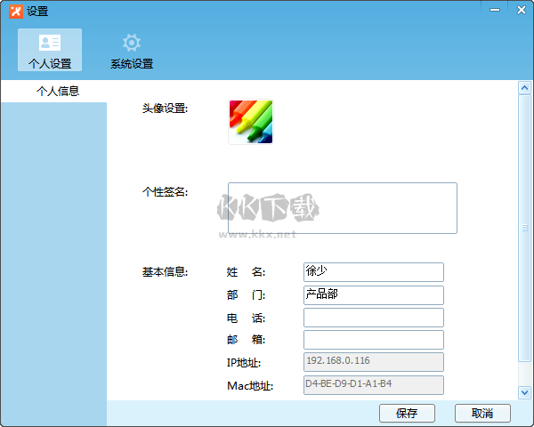 通過“個人設置”,用戶可以自定義頭像、修改簽名、姓名、部門等信息,點擊保存后,局域網(wǎng)用戶可以查看到您設置的信息。