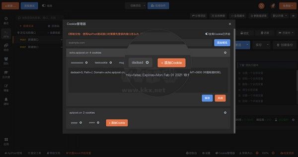 支持Cookie管理,發(fā)送接口時(shí),可以攜帶自定義的Cookie進(jìn)行模擬登錄