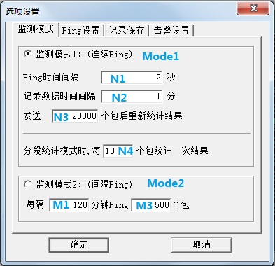 Mode2:把系統(tǒng)的默認Ping模式設置為間隔Ping模式。在這種模式下,系統(tǒng)將定時地向目標主機發(fā)送數(shù)據(jù)包,每隔 M1 分鐘 向目標主機發(fā)送 M2 個 數(shù)據(jù)包。同時對這 M2 個數(shù)據(jù)包的返回信息進行統(tǒng)計,統(tǒng)計出這 M2個 數(shù)據(jù)包返回信息的 最大響應時間、最小響應時間、平均響應時間、發(fā)送數(shù)據(jù)包的個數(shù)、丟失數(shù)據(jù)包的個數(shù)、丟包率等等,并且將統(tǒng)計的結果進行記錄。