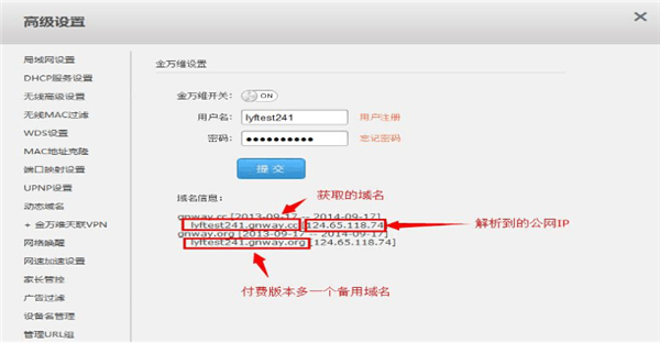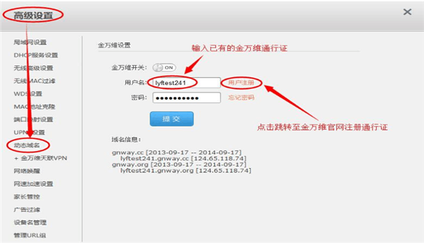 第一步:點(diǎn)擊“高級(jí)設(shè)置”,進(jìn)入動(dòng)態(tài)域名,使用您注冊(cè)的金萬維動(dòng)態(tài)域名賬號(hào)和密碼登錄,如果沒有賬號(hào)可以點(diǎn)擊注冊(cè)