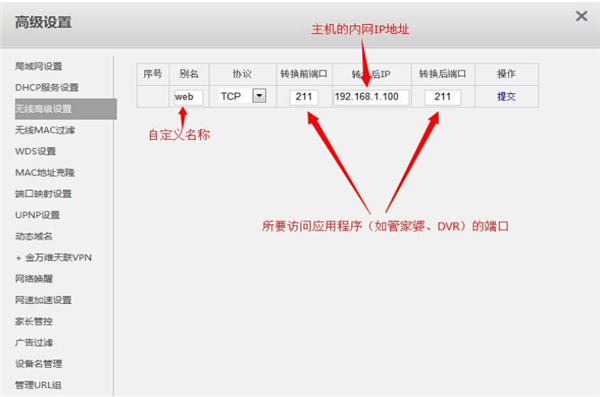 第三步:配置端口映射,將您要訪問的系統(tǒng)(如管理軟件、攝像頭、DVR)的端口與主機(jī)(服務(wù)器或其他硬件設(shè)備)的內(nèi)網(wǎng)IP建立對(duì)應(yīng)關(guān)系
