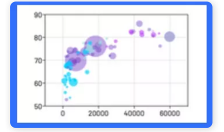 在此圖上,超過100個國家/地區(qū)顯示為單個圓圈。每個圓圈的X坐標代表該國的GDP(PPP),而Y坐標代表出生時的平均預(yù)期壽命。每個符號的大小與其所代表的國家的人口成比例(兩個最大的符號分別代表中國和印度)。最后,每個符號的顏色代表該國家所在的大陸。在這種情況下,此最終變量(顏色)是分類變量,但氣泡圖中的顏色也可以由連續(xù)變量定義:在該圖中,符號的X坐標,Y坐標和大小與以前相同。但是,現(xiàn)在該符號的顏色連續(xù)不斷地代表該國家每1000個人的出生率。棱鏡現(xiàn)在還具有內(nèi)置的半透明配色方案,以便可以更清晰地看到重疊的符號。