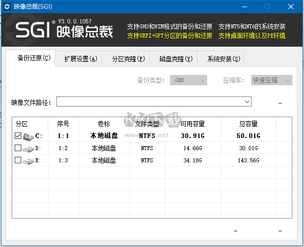 9、備份還原:支持GHO和WIM的備份和還原、支持GPT分區(qū)的備份還原、支持桌面環(huán)境和PE環(huán)境下的操作,支持NT6系統(tǒng)的直接安裝;