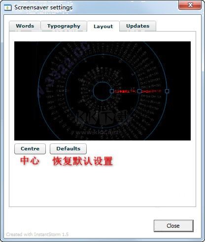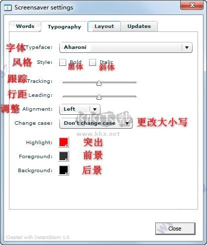 4、在字體和樣式設(shè)置中一共有直線、旋轉(zhuǎn)、隨機(jī)三種樣式,點(diǎn)擊“Chinese”即可將屏保設(shè)置成中文;