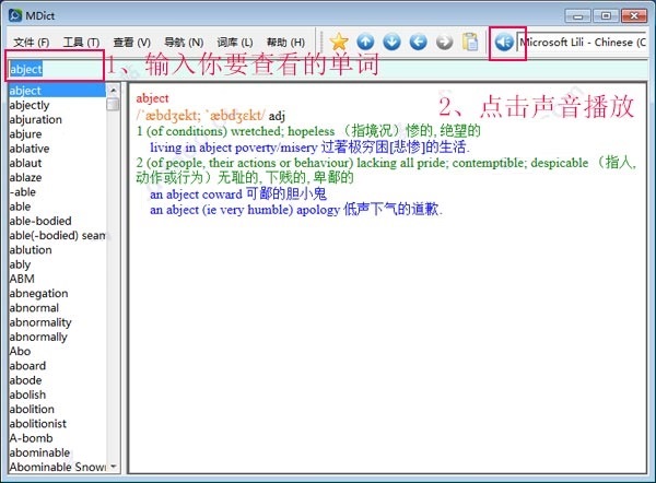4、輸入你要查詢的單詞,點擊聲音可以播放,內容在下面查看。