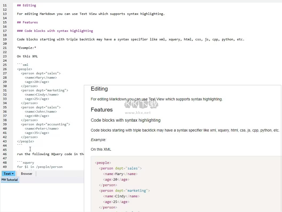 XMLSpy 支持在瀏覽器視圖中查看渲染的 Markdown (.md) 文件,并在文本視圖中使用語(yǔ)法著色對(duì)其進(jìn)行編輯。版本 2024 附帶了示例 Markdown 文檔和教程,用于快速開(kāi)始使用 Markdown 語(yǔ)法,添加粗體和斜體等格式元素以及基于指定語(yǔ)言(例如 XML、JSON、Python、HTML)自動(dòng)語(yǔ)法著色的代碼塊, ETC。