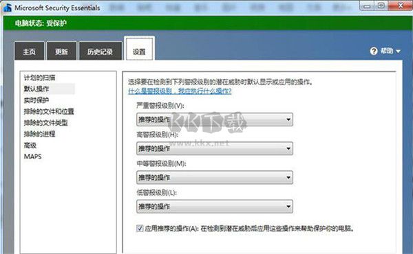 2、進(jìn)入到設(shè)置界面后選擇【默認(rèn)操作】,我們可以設(shè)置有關(guān)MSE殺毒軟件Security Essentials對(duì)警報(bào)的處理方法,選擇你需要的處理方法即可。