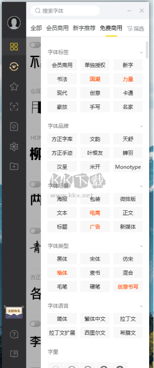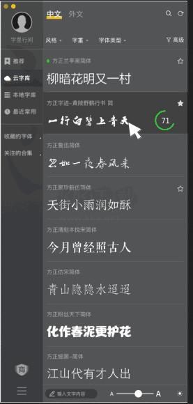 字加FounderFont電腦版是一款高效的免費的幫助用戶們進行字體的獲取使用的交流設計平臺,用戶們可以在這里便捷的找到你需要的字體來進行使用,這里擁有豐富的功能提供給大家讓你可以快速的在線實現(xiàn)自定義的收藏你想要的字體格式,還能便捷的免安裝進行字體的使用,超多的字體服務功能提供給你,感興趣的用戶快來KK下載體驗吧~
