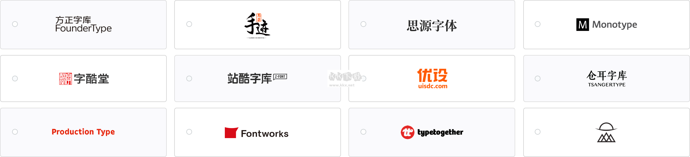 字加精選方正,字酷堂,蒙納等數(shù)十個常見字體品牌,一萬多款精美字體!