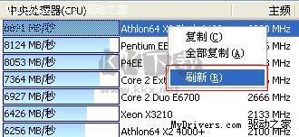 我舉例測試一下自己的內(nèi)存讀取性能,點擊“內(nèi)在讀取”,然后在右邊列表框里右擊-刷新,稍等即可查看自己的內(nèi)存讀取情況。你可以參考列表所給出的配置情況對比自己的內(nèi)存讀取速度排一個什么樣的位置。