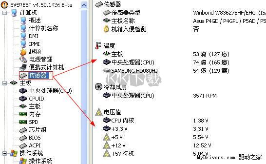 在“計算機(jī)”里,點擊“傳感器”即可詳細(xì)顯示主板、CPU、硬盤的溫度及CPU的電壓。