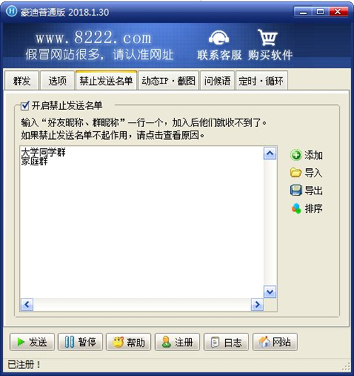 6、如果你不想讓某些用戶收到群發(fā)的消息,只需將他們的qq昵稱加入禁止發(fā)送名單