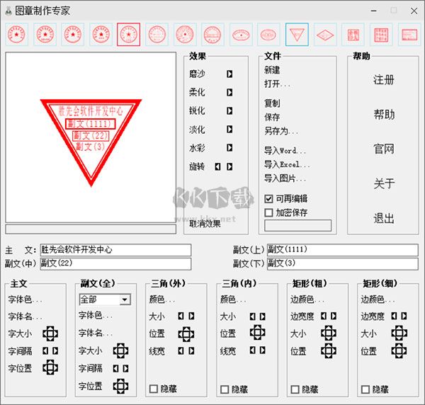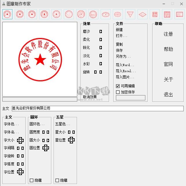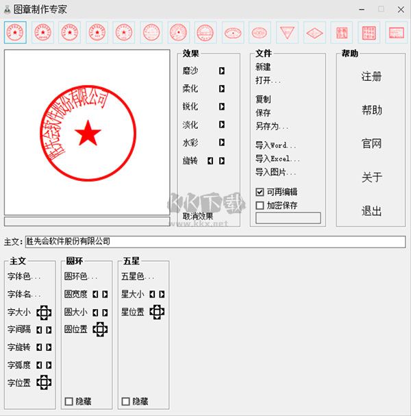 2、使用靈活:設(shè)計(jì)時(shí),可以對(duì)每一種圖章的大小、文字、顏色等各項(xiàng)目進(jìn)行仔細(xì)設(shè)置。生成的圖章,可以在各種圖形、圖像、文字、表格等軟件中套打