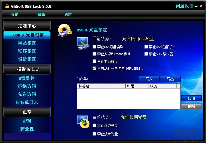 該程序可用于限制對可移動媒體設備(如CD,DVD,軟盤,SD卡讀卡器,閃存和USB驅(qū)動器)的讀寫訪問。它還可用于禁用iPhone,Android手機,打印機,調(diào)制解調(diào)器,com lpt端口,紅外線,藍牙,1394端口。