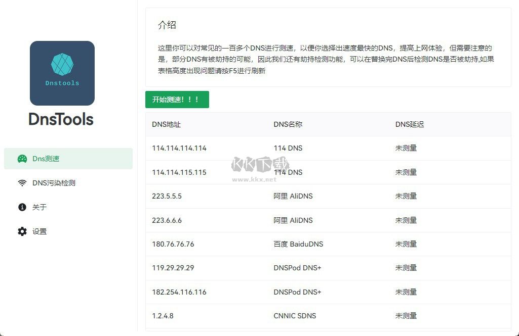 DnsTools綠色版是一款輕量級高效好用的DNS測速和污染監(jiān)測工具,用戶們在DnsTools綠色版結(jié)合了超多的高性能和易用性的功能提供給大家,能夠很好的幫助用戶們進(jìn)行DNS的選擇,來優(yōu)化你的網(wǎng)絡(luò)情況,幫助你高效的進(jìn)行網(wǎng)絡(luò)的連接使用,感興趣的用戶快來KK下載體驗(yàn)吧~