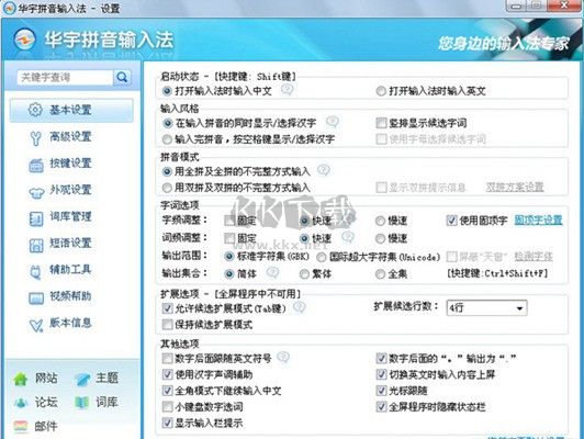 精選的大容量詞庫,超強的用戶定制功能,支持全拼、雙拼、模糊音、大字符集等。