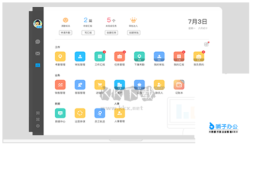 軟件共有企業(yè)郵箱、即時(shí)通訊、考勤打卡、任務(wù)跟進(jìn)、即時(shí)審批、工作匯報(bào)、銷售管理、客服服務(wù)、數(shù)據(jù)中心、運(yùn)營參謀這八大功能模塊。