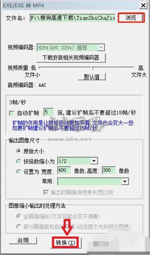 2、彈出“EXE/LXE轉(zhuǎn)MP4”窗口,點(diǎn)擊【瀏覽】,在本地硬盤中選擇要轉(zhuǎn)換的exe格式視頻,其他保持默認(rèn),然后點(diǎn)擊窗口下面的【轉(zhuǎn)換】;
