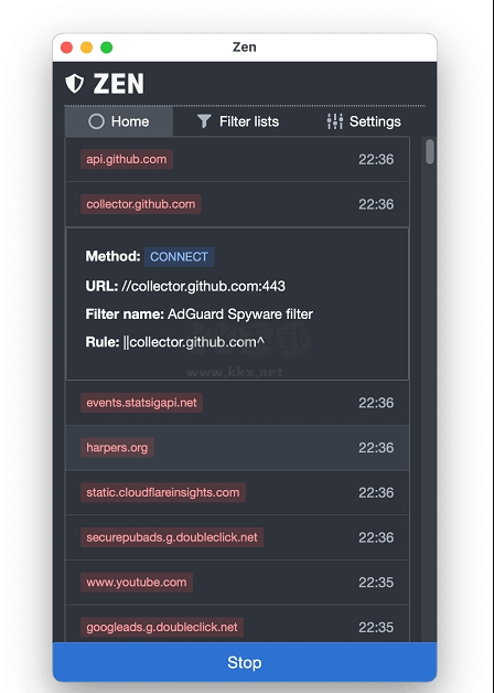 在「Zen」主頁可以看到過濾阻止的記錄,點(diǎn)擊可以查看詳情情況,包括地址、規(guī)則、請(qǐng)求等。