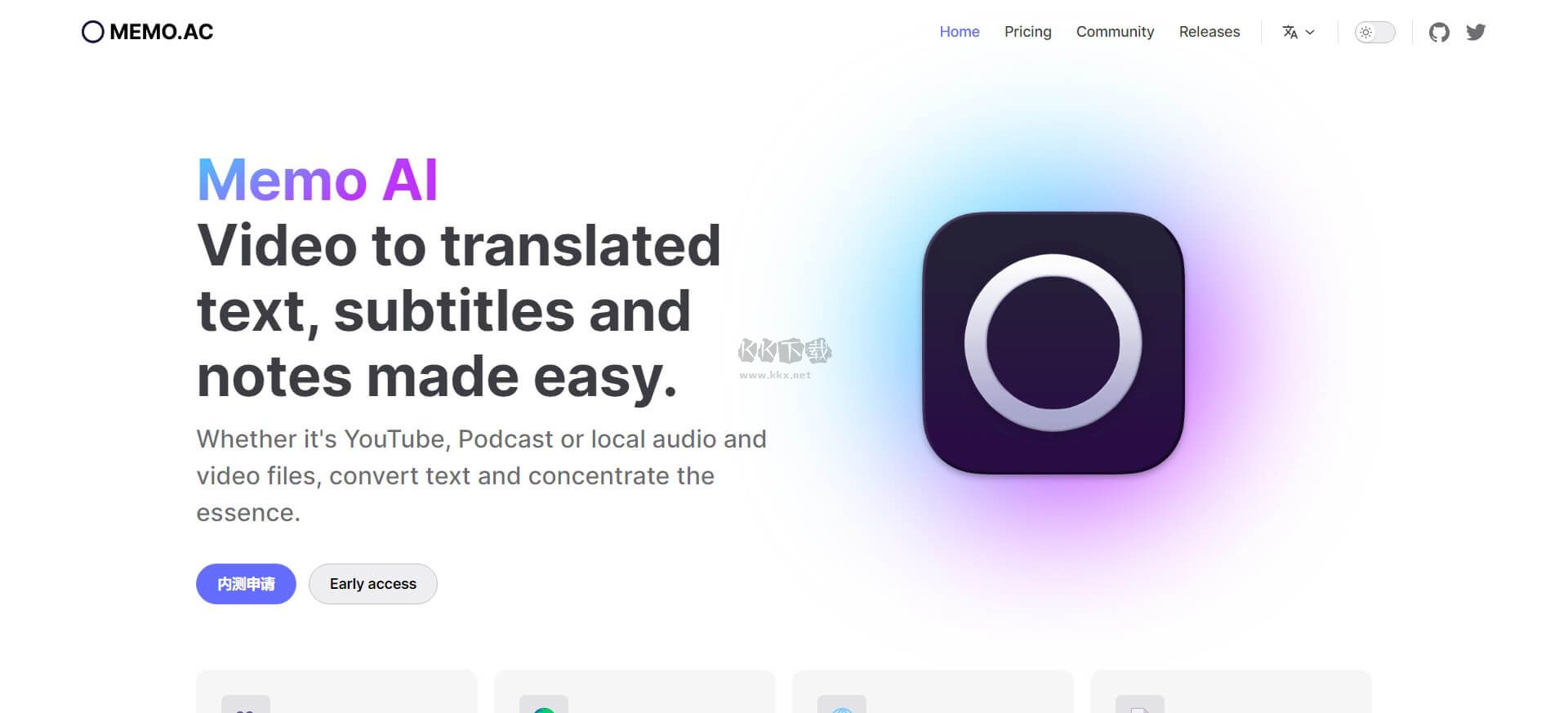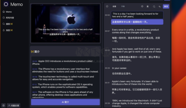 Memo AI視頻字幕工具是一款小型好用的AI音視頻轉(zhuǎn)譯工具,支持用戶們在線利用AI技術(shù)來進行YouTube等視頻的轉(zhuǎn)文字,支持多種語種之間的翻譯使用,你可以在這里高效的進行AI音視頻轉(zhuǎn)譯個工具適用于多種場景讓用戶們可以在這里便捷的提供視頻字幕,還能對字幕進行調(diào)節(jié)使用,輕松的進行編輯,感興趣的用戶快來KK下載體驗吧~