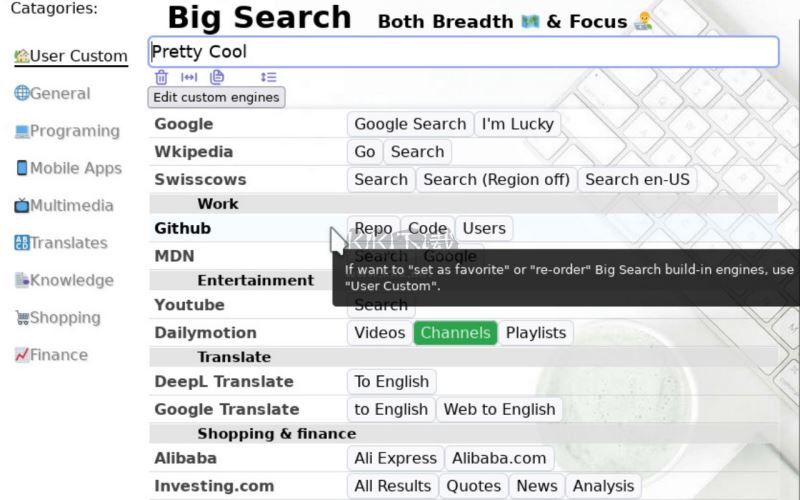 新手友好,專家滿意。包括日常、娛樂及工作。 在俱有了 一個 多搜索引擎工具 該有的基本功能(GET/POST、自定引擎、內(nèi)置 Google,Youtube,Github,淘寶 等)之后,它還可以: