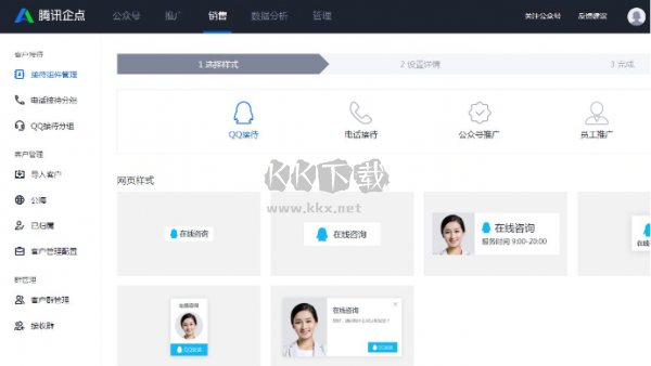 3、根據(jù)不同接待渠道,選擇投放的不同樣式。如QQ接待組件可投放到網(wǎng)頁,QQ公眾號圖文,H5及生成二維碼/超鏈等。