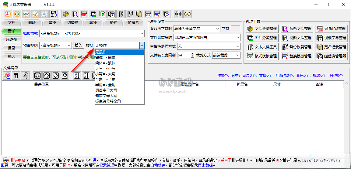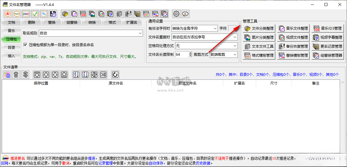 1、自動(dòng)更名:僅針對(duì)文檔、音樂(lè)、壓縮包、目錄,自動(dòng)在文件列表中找此類(lèi)文件進(jìn)行重名,建議先檢查相關(guān)設(shè)置