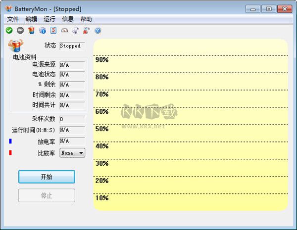 BatteryMon 筆記本電池校正修復工具界面信息有電池狀態(tài)、剩余百分比、運行時間、放電率等,有空的可以研究研究,簡單粗暴型的直接看到左下的開始、結(jié)束兩個按鈕即可。縱坐標表示當前所剩電池電量百分比,橫坐標表示電池使用時間。