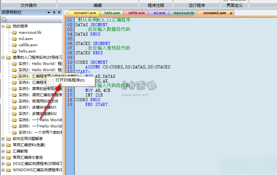 2..方便練習資源導航欄中的“簡單的入門程序?qū)嵗?rdquo;、“DOS匯編實例源程序”、“WINDOWS匯編實例源程序”中的程序,如圖所示,右鍵打開簡單入門程序?qū)嵗械腍ello World程序?qū)φ站毩暋?/p>