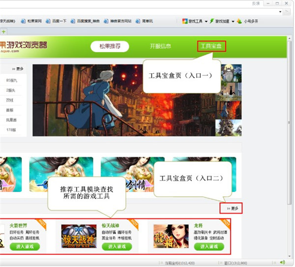 1、我們先松果游戲瀏覽器,在默認頁的“推薦工具”模塊找到所需的游戲工具。