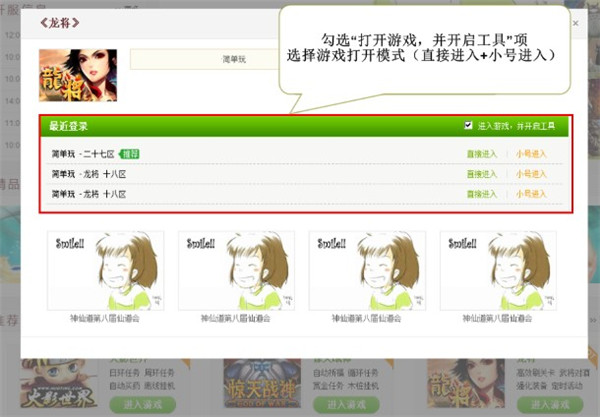 3、若之前使用過松果玩游戲,則在最近登錄內(nèi)可以查看相關(guān)的游戲記錄,勾選“進入游戲,并開啟工具”項(默認選中),然后點擊“直接進入”或“小號進入”即可快速進入游戲并打開工具。