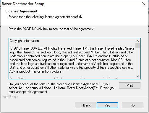 2、進(jìn)入雷蛇鼠標(biāo)驅(qū)動安裝協(xié)議界面,點擊【yes】