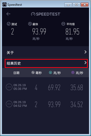 即可在下方看到歷史檢測網(wǎng)速結(jié)果,點擊“結(jié)果歷史”