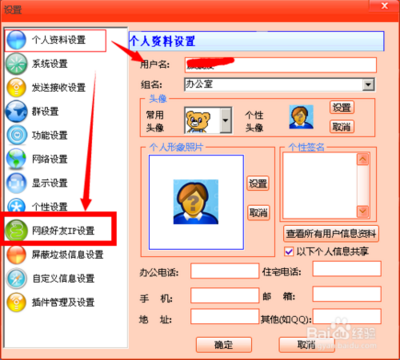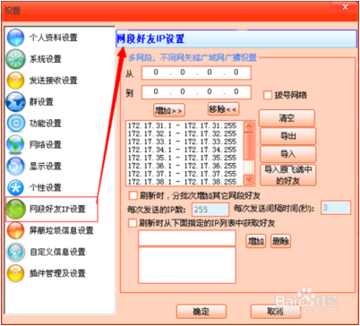 4、打開設(shè)置界面后,可以先修改一下自己的名稱和組,默認(rèn)用戶名是電腦的登錄用戶,設(shè)置好后,選擇左側(cè)的“網(wǎng)段好友IP設(shè)置”,打開“網(wǎng)段好友IP設(shè)置”界面。輸入你好友的網(wǎng)段地址,點擊增加,如圖所示: